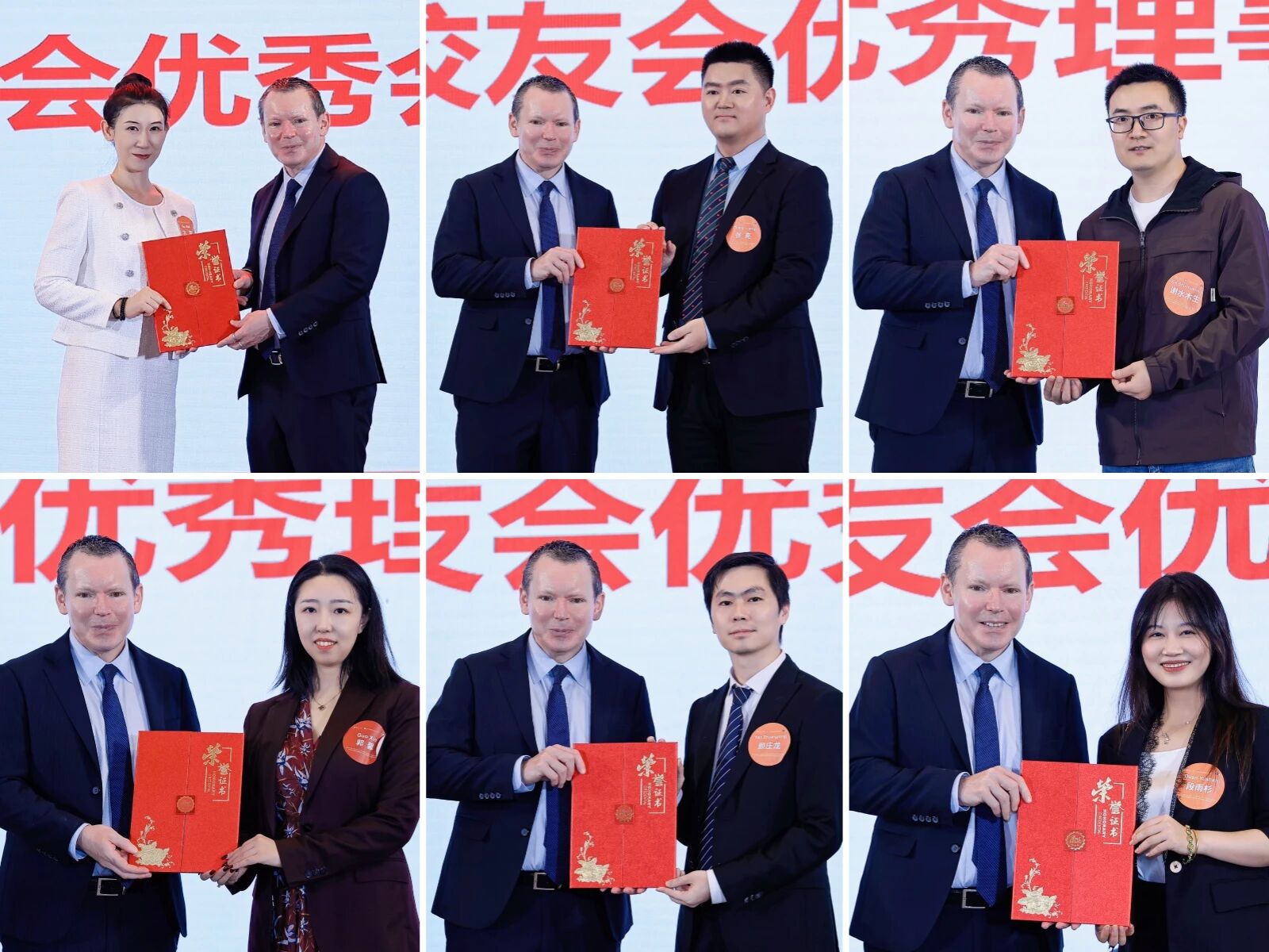大会对为校友会工作做出突出贡献的校友进行了表彰。赵枫(10级京)、朱旭(08级沪)获“优秀副会长”称号;徐可(12级京)、吴焱斌(17级京)、徐嘉隆(11级沪)获“优秀副秘书长”称号;张双(13级京)、吴涵(08级京)、彭奕然(10级京)、郭馨(15级京)、陆明(19级京)、谢水木生(19级深)、彭倩(11级深)、段雨杉(20级深)、刘淑杰(10级深)、孙小莉(09级深)、王雨诗(16级深)、刘文园(13级深)、张一凡(19级沪)、颜庄龙(14级穗)、黄坚(10级穗)、蒋倩倩(15级西北)、张洞天(13级西南)、王腾(13级伦敦/阿姆斯特丹)获“优秀理事”称号。古黛被北大深研院校友会授予“优秀会长”称号,张亮被授予“优秀秘书长”称号。Mark Feldman院长为现场获奖校友颁奖。