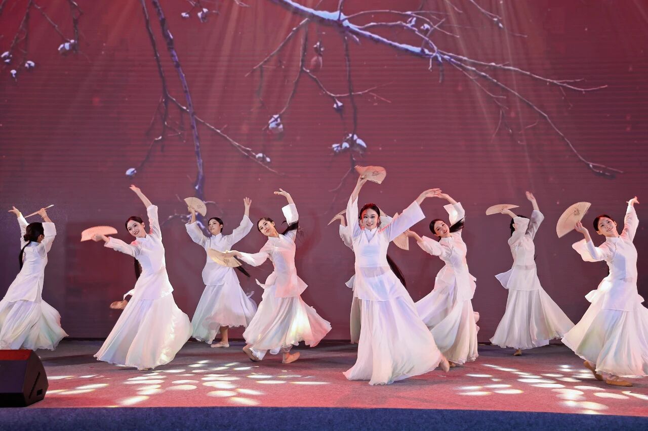 随后,康弘、陈珊莹、王晴、郭开颜、李唯依、马玥桐、陈思宇、高天资、马悦宁九位同学带来舞蹈《香扇藏春》,巧妙融合中国古典舞韵与现代编排,一扇一袖间生动演绎了中华美学的含蓄与灵动。